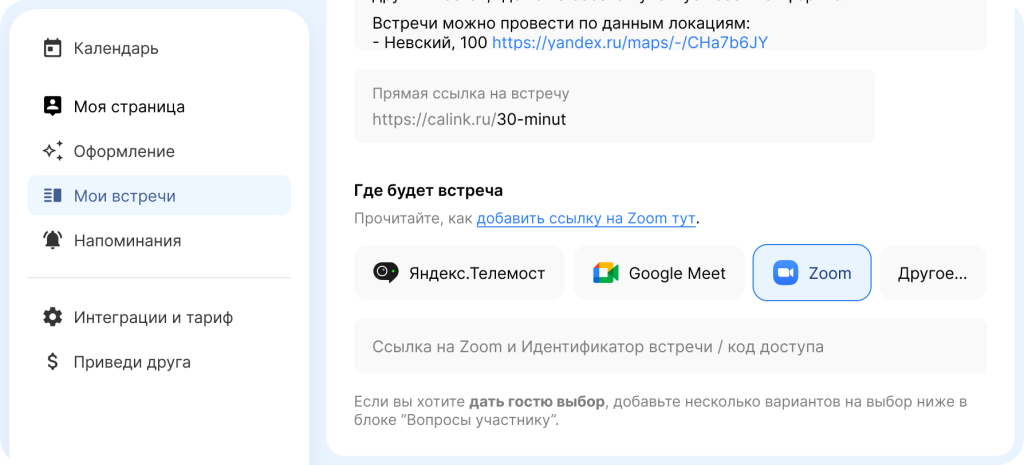 Вы можете выбрать место встречи в настройках каждого типа встреч.