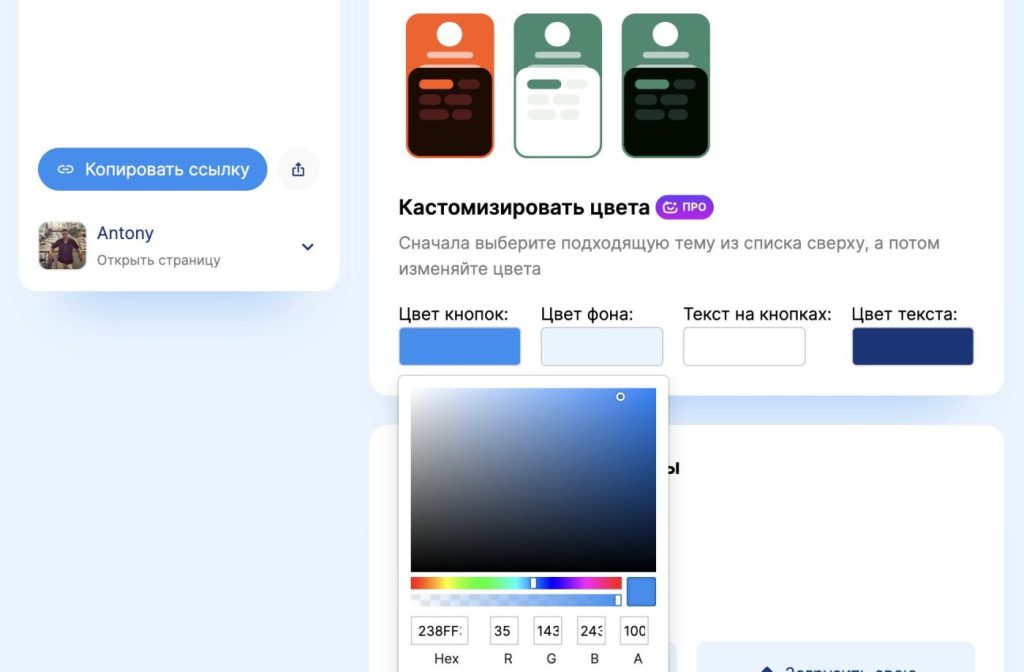 В админке перейдите в раздел «Оформление» — там вы можете выбрать цветовую схему для своей страницы. На бесплатном тарифе доступны две светлые темы: розовая и синяя. На ПРО-тарифе доступно больше вариантов, включая темные версии.