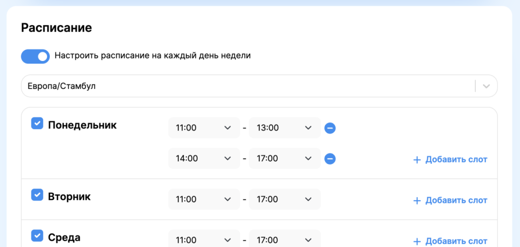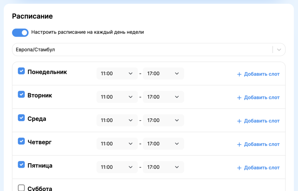 В настройках типа встреч вы можете выбрать рабочие дни (например, пн-пт) и указать единый интервал работы для всех этих дней (например, с 10 до 18).
