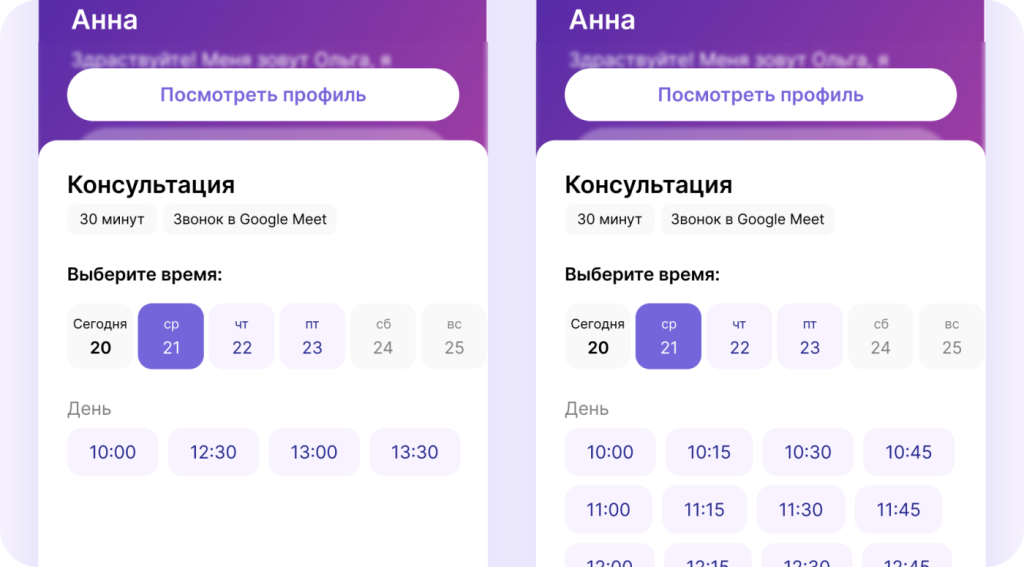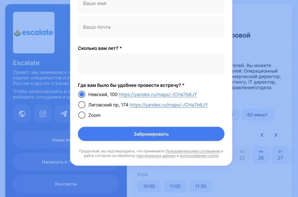 «Шаг записи» — это настройка, которая определяет, как будут отображаться свободные слоты времени на вашей странице. Например, если шаг — «каждый час», клиенты увидят слоты 10:00, 11:00, 12:00. Если шаг — «каждые полчаса», слоты будут 10:00, 10:30, 11:00 и так далее. Эта функция находится в настройках встречи.