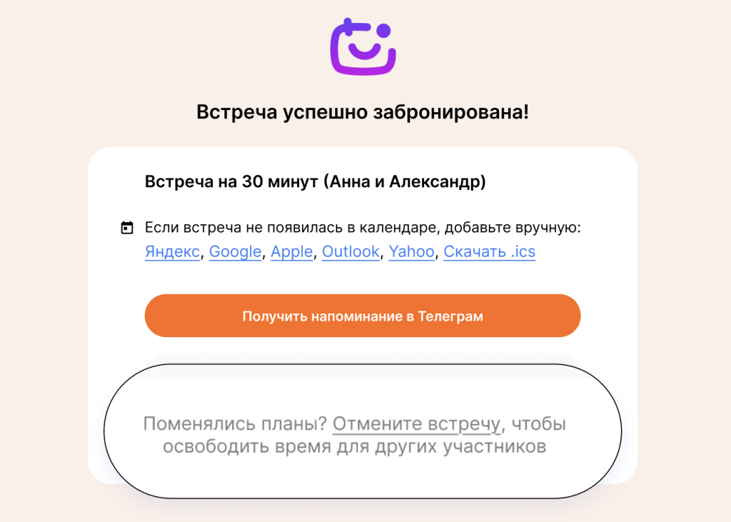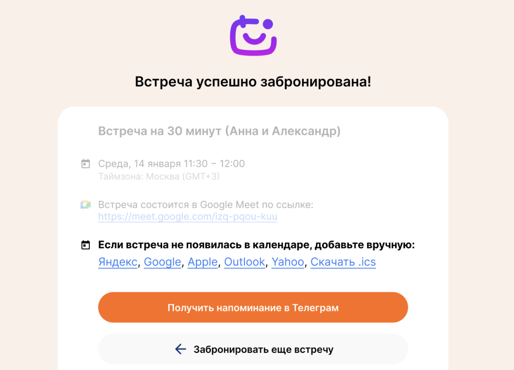Ваш гость откроет страницу, выберет подходящее время, укажет имя и почту и забронирует встречу. Далее он может подключить свой Телеграм, чтобы получить напоминания и подтвердить свою явку перед встречей. На почту и в календарь тоже будут отправлены детали встречи со ссылкой на видео-конференции, который вы выберете в настройках встречи.