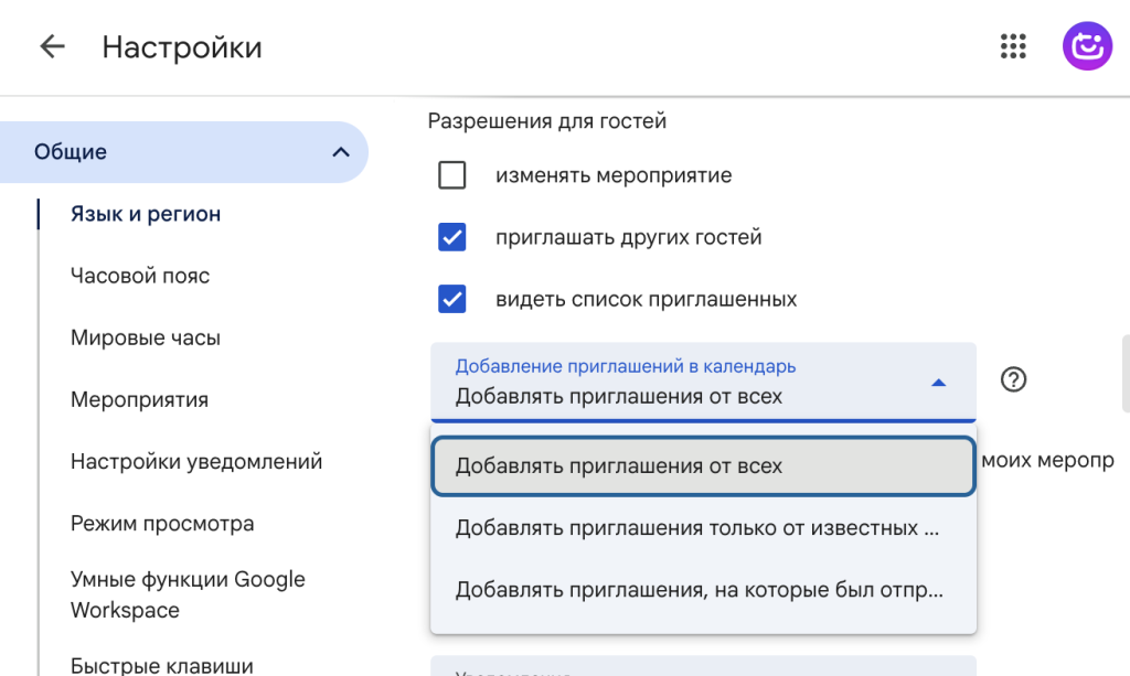 2. Если в настройках Google Календаря запрещено добавлять встречи от людей, не добавленных в Google Контакты. Для того, чтобы позволить Calink добавлять встречи в Google Календарь, откройте Настройки календаря и в блоке «Разрешения для гостей» выберите «Добавлять приглашения от всех». Более детальная инструкция вот тут.