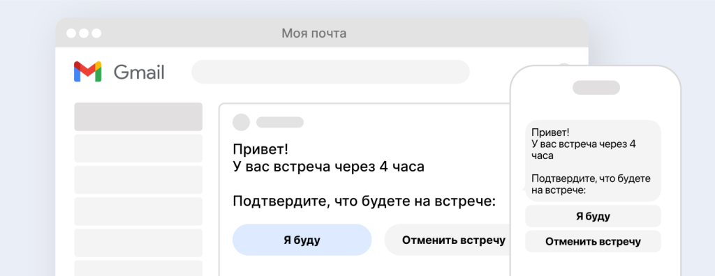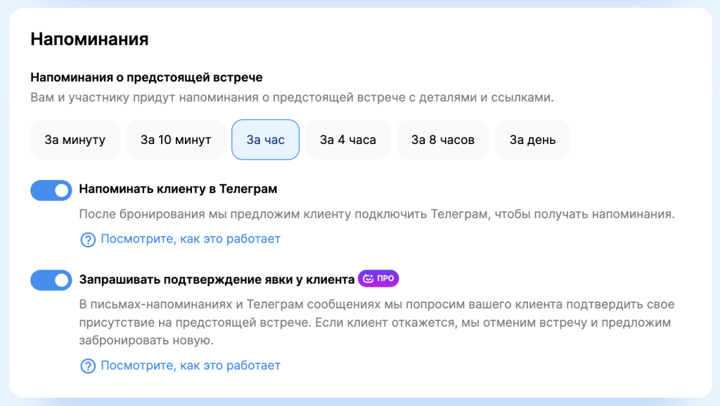 Это функция ПРО-тарифа, которая помогает бороться с неявками. Если она включена, в письмах-напоминаниях и сообщениях в Телеграм клиенту будет предложено подтвердить свое присутствие. Например, за час до встречи ему придет сообщение с двумя кнопками: «Я буду на встрече» и «Не смогу, отмените встречу». Если клиент нажмет на отмену, встреча будет автоматически отменена, и система предложит ему забронировать новую.