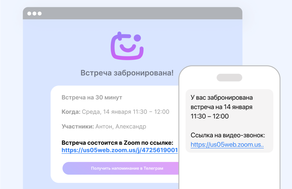 Если клиент нажмет на кнопку «Получить напоминание в Телеграм», то уведомление о бронировании будут отправлены ему и в Телеграм. А перед встречей на почту и в Телеграм придут напоминания.