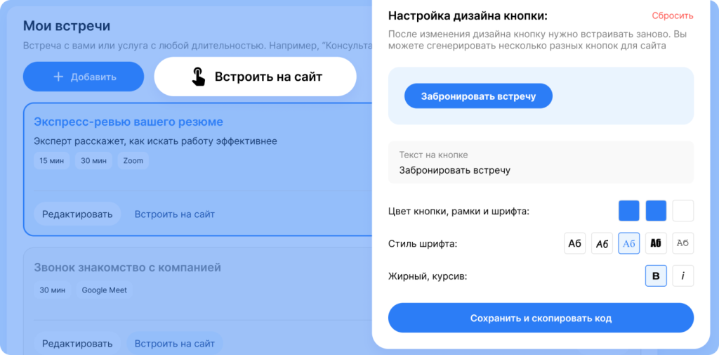 Перейдите в раздел «Встречи». Чтобы встроить все встречи, нажмите кнопку «Встроить на сайт» в шапке раздела. Чтобы встроить конкретную встречу, нажмите на такую же кнопку у нужного типа встреч.