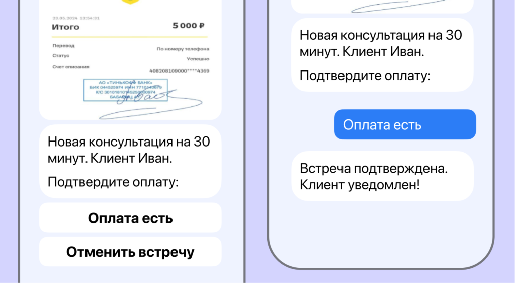 Вам придет уведомление в Телеграм с деталями встречи и скриншотом от клиента. В уведомлении вы сможете проверить оплату и подтвердить бронь нажатием на кнопку.