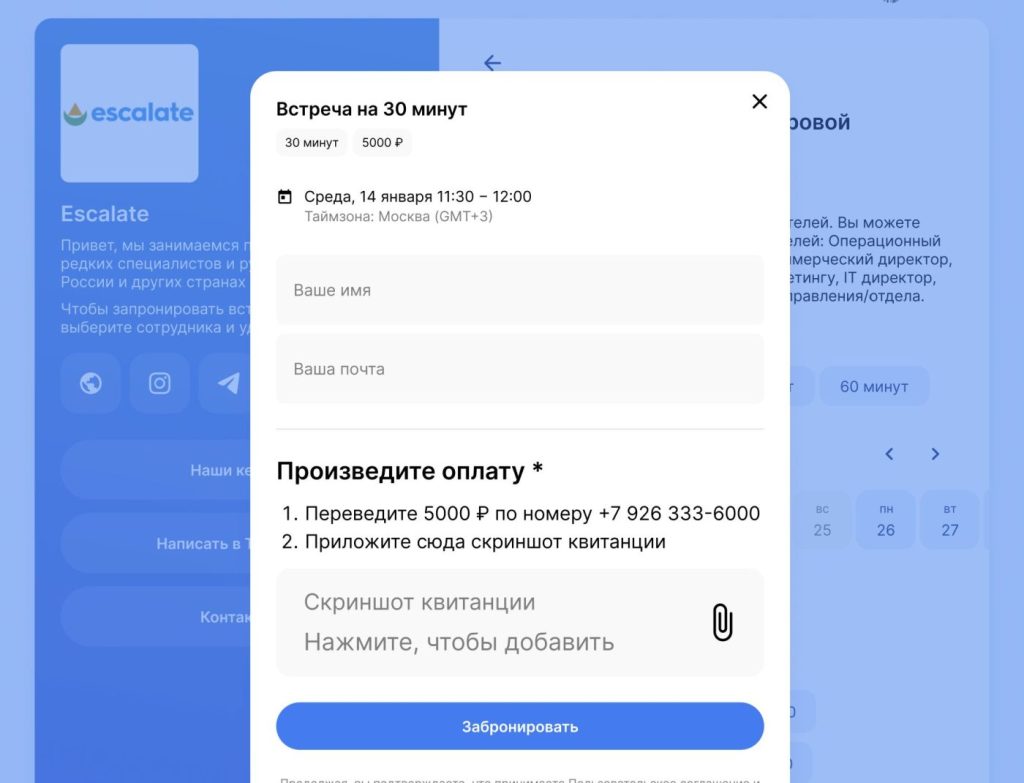 Клиент увидит эту инструкцию, переведет деньги и прикрепит скриншот квитанции для завершения бронирования.