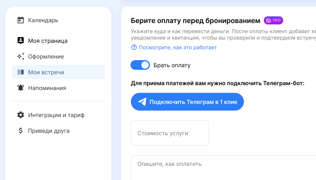 Эта функция доступна на ПРО-тарифе. При редактировании типа встреч включите опцию «Платные встречи».