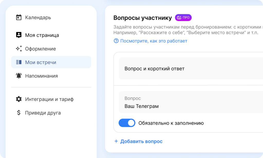 Вы можете добавить поле для ввода Telegram с помощью ПРО-функции «Вопросы клиенту». Для этого в настройках нужного типа встреч добавьте вопрос с коротким ответом и назовите его «Ваш Телеграм». Многие пользователи приобретают ПРО-тариф именно ради этой возможности.