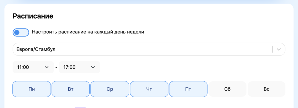 Как настроить простое расписание на всю неделю (например, пн-пт с 10:00 до 18:00)?